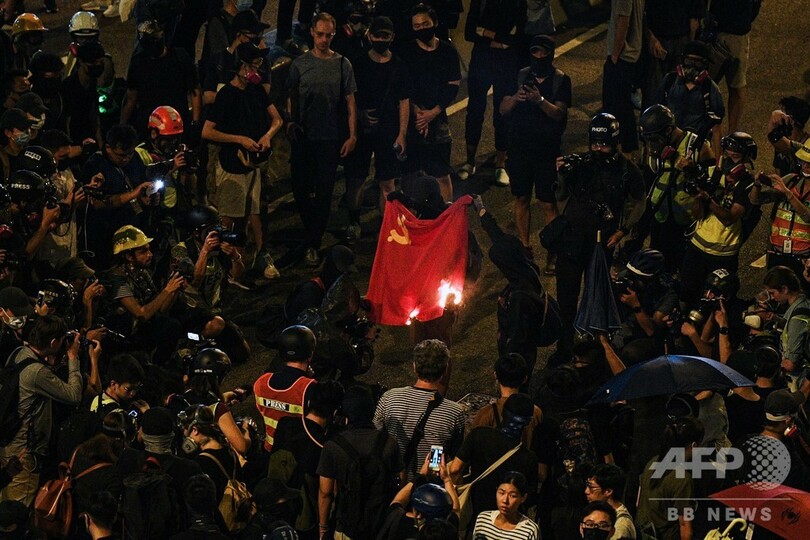 「世界に配信されるのは、中国の祝賀式典ではなく、燃える香港の映像だろう。中国のプロパガンダ組織が発信したがっている、慎重に作り上げた安定と繁栄のイメージは、それによって崩される」 (c)AFP/Poornima WEERASEKARA