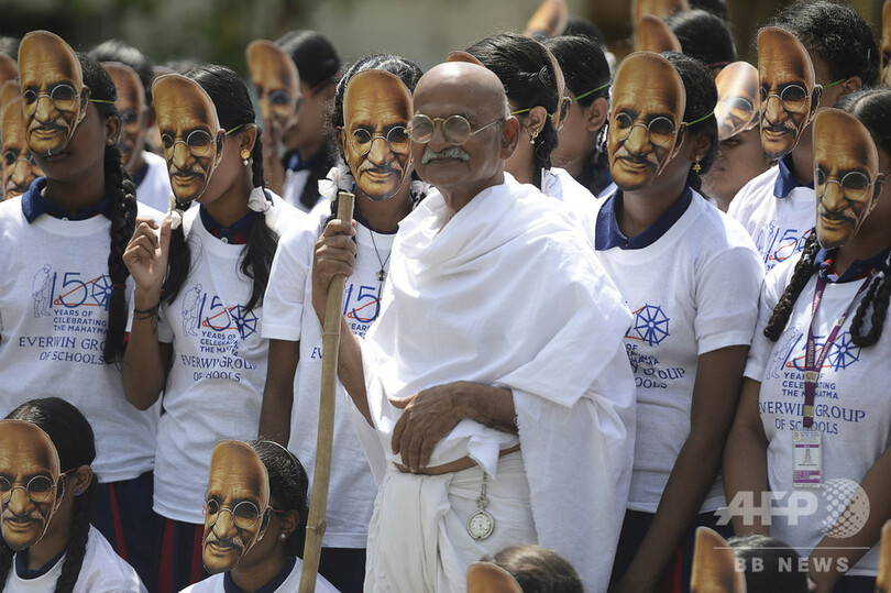 【10月8日 AFP】インド・チェンナイ(Chennai)の学校で、マハトマ・ガンジー(Mahatma Gandhi)生誕150周年を前に、ガンジーのマスクを着けた生徒ら。インド中の人々が、ガンジーの誕生日である10月2日を祝う。(c)AFP