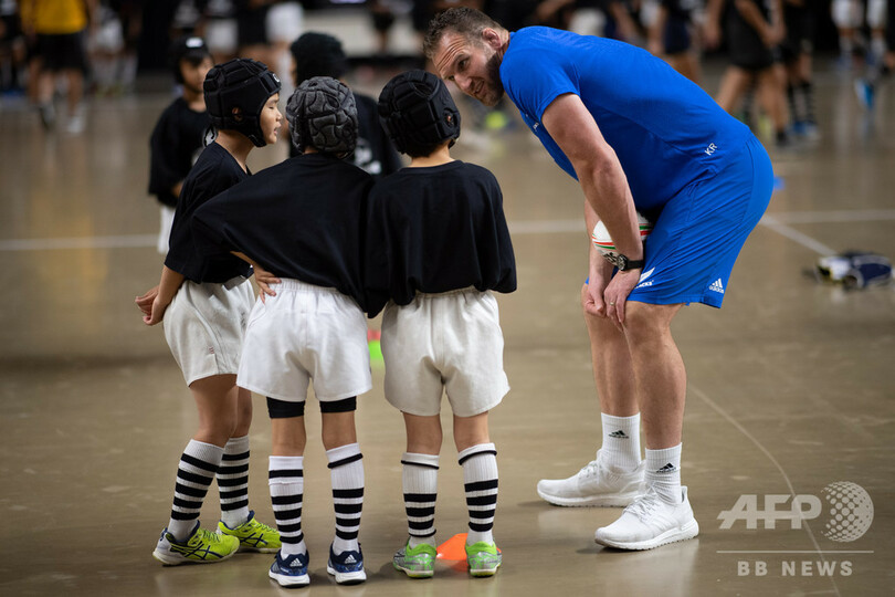 【10月9日 AFP】ラグビーW杯日本大会(Rugby World Cup 2019)開催期間中、大分県別府(Beppu)市で行われたラグビーニュージーランド代表「オールブラックス(All Blacks)」とのファン交流イベントで、子どもたちと話す同チームのキーラン・リード(Kieran Read)。(c)AFP