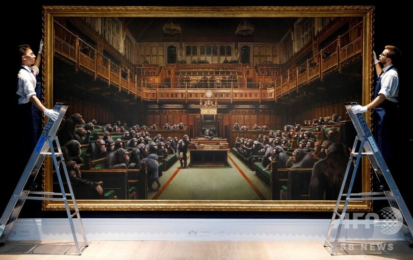 【10月4日 AFP】議員の代わりにチンパンジーが着席している英議会を描いた英国の覆面ストリートアーティスト、バンクシー(Banksy)の絵画が3日、競売に掛けられ、バンクシー作品で過去最高額となる約990万ポンド(約13億円)で落札された。競売大手サザビーズ(Sotheby's)が明らかにした。