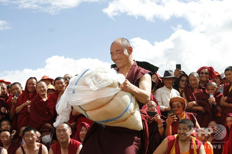 別の場所では、大柄で体重の重そうな僧侶の出場だ。大声援の中、75キロと100キロの砂袋の前でやや躊躇(ちゅうちょ)したあと、軽いほうを選び、肩の上に担ぎ上げようとするが、あと少しで成功というところで、これも失敗に終わった。