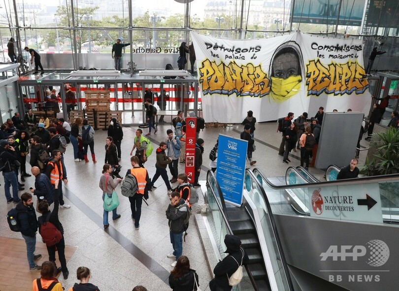 この日の占拠には「絶滅への反逆」の活動家のほか、仏政府の政策に抗議する「ジレ・ジョーヌ(黄色いベスト、gilets jaunes)」など他の運動からも参加者があった。