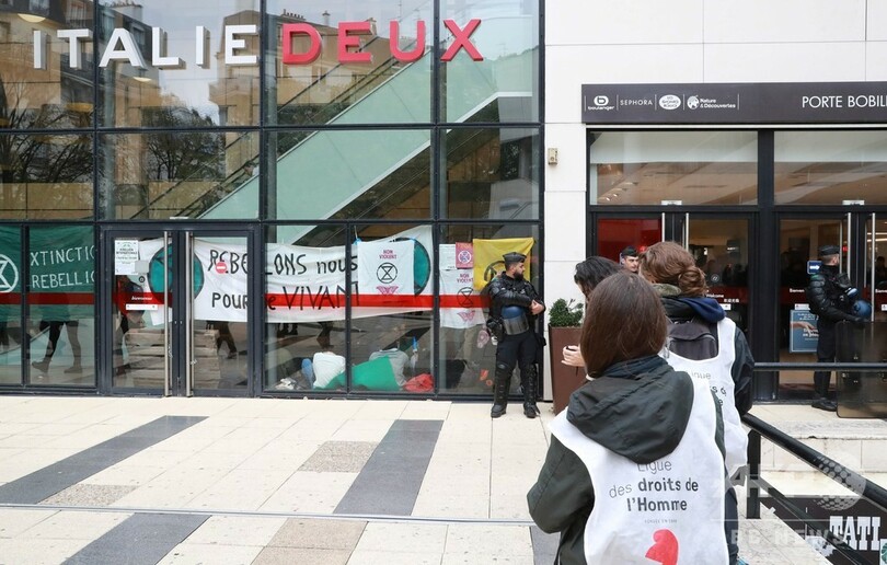「絶滅への反逆」の参加者らは、パリ南部のショッピングモール「イタリー2(Italie 2)」の入り口に椅子やテーブルでバリケードをつくり、警官や不便を強いられた買い物客らとにらみ合いになった。モール内のレストランや高級ブティックの上には、「ガソリンではなく資本主義を燃やせ」などと書かれた横断幕が掲げられた。