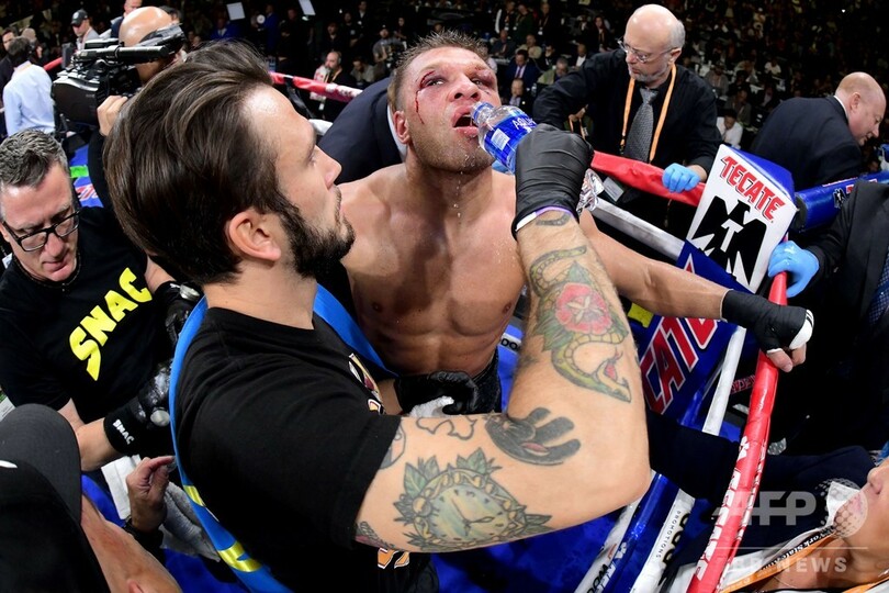 一方のデレイビャンチェンコは、これで13勝(10KO)2敗。2020年中の3回目のゴロフキン対アルバレス戦実現に待ったをかけるべく、大番狂わせを狙っていたが、わずかに届かなかった。(c)AFP