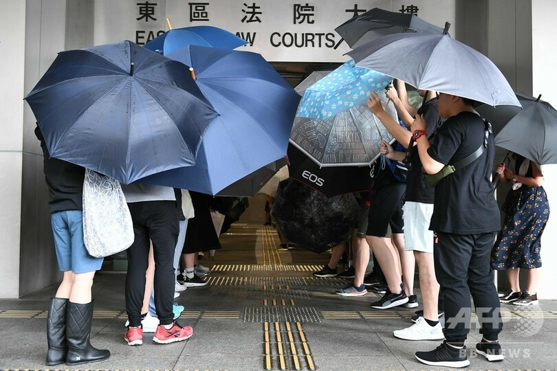 【10月7日 AFP】香港で7日、先週末から今週にかけて行われた抗議活動に絡み、デモ参加者に覆面着用を禁止する緊急条例に違反したとして逮捕されたデモ参加者2人が起訴された。法律施行後、起訴は初めて。2人が出廷した裁判所の外には、緊急条例に抗議する人たちがマスクなどで顔を覆った姿で押し寄せた。