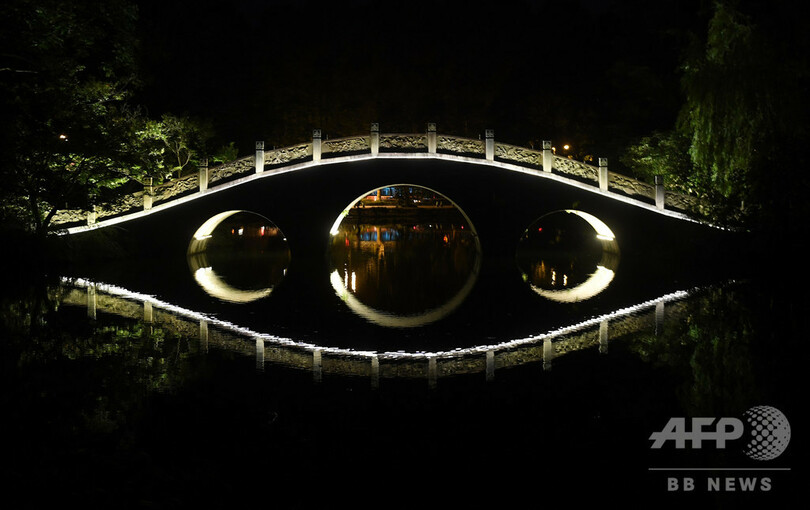 【10月9日 CNS】中国・浙江省(Zhejiang)杭州市(Hangzhou)の西湖(West Lake)で2日の夜、国慶節のライトアップが行われた。色彩豊かな光の流れに導かれ、引き返すのを忘れてしまいそうな西湖の夜景は、観光客を魅了していた。(c)CNS/JCM/AFPBB News