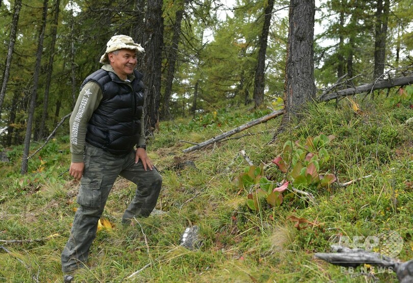 セルゲイ・ショイグ(Sergei Shoigu)国防相と共に、シベリア(Siberia)のエニセイ(Yenisei)川沿いの山へ週末旅行に出掛けたプーチン氏は、キノコ狩りを楽しんだ。