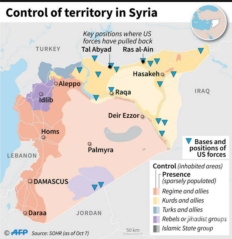 青い三角:米軍の基地および拠点、赤:シリア政府とその同盟勢力、黄:クルド人とその同盟勢力、青:トルコ軍とその同盟勢力、紫:シリア反体制派またはイスラム過激派組織。黒(灰色):イスラム国(IS)※各色、濃い着色は「支配」「居住」、薄い着色は「プレゼンス」「点在」を意味する。(2019年10月7日作成)。(c)SOPHIE RAMIS, PAZ PIZARRO / AFP