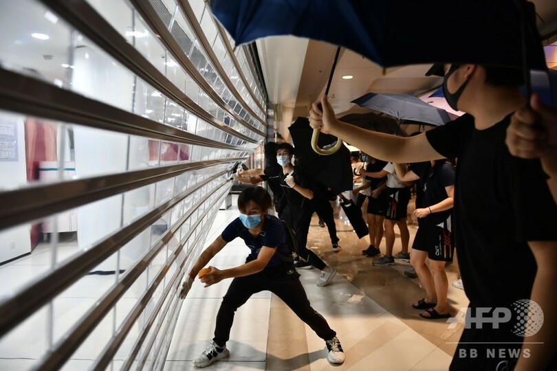強硬派のデモ参加者らは7日夜、複数の店舗で破壊行為に及んだ上、複数の箇所で道路を閉鎖し、地下鉄の2つの駅を荒らした。警察は少なくとも3か所で催涙弾を発射したが、デモ隊との衝突は最近のものとしては時間も短く、規模も小さかった。(c)AFP/Jerome TAYLOR / Jasmine LEUNG