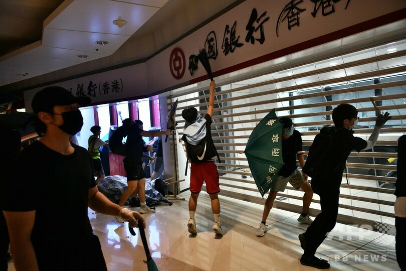 強硬派のデモ参加者らは7日夜、複数の店舗で破壊行為に及んだ上、複数の箇所で道路を閉鎖し、地下鉄の2つの駅を荒らした。警察は少なくとも3か所で催涙弾を発射したが、デモ隊との衝突は最近のものとしては時間も短く、規模も小さかった。(c)AFP/Jerome TAYLOR / Jasmine LEUNG