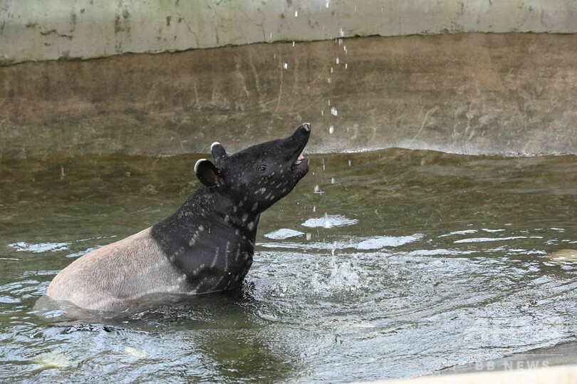 マレーバクの赤ちゃんが水遊び まだまだら模様も