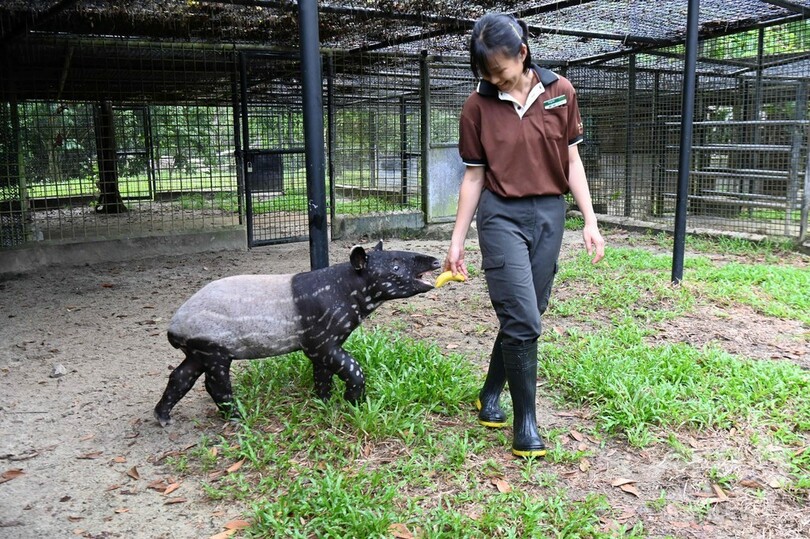 マレーバクの赤ちゃんが水遊び まだまだら模様も