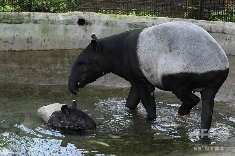 マレーバクの赤ちゃんが水遊び まだまだら模様も