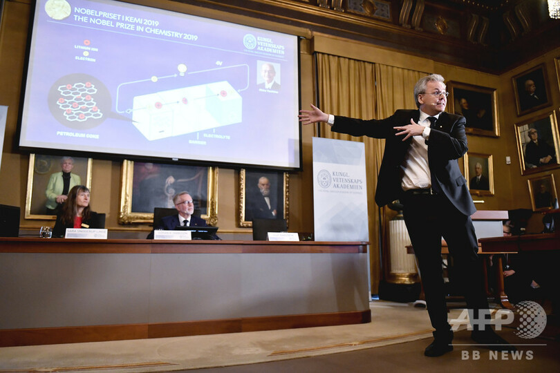 【10月9日 AFP】(更新、写真追加)スウェーデン王立科学アカデミー(Royal Swedish Academy of Sciences)は9日、2019年のノーベル化学賞(Nobel Prize in Chemistry)を、リチウムイオン電池を開発した吉野彰(Akira Yoshino)氏(71)、米国のジョン・グッドイナフ(John Goodenough)氏(97)、英国のスタンリー・ウィッティンガム(Stanley Whittingham)氏(77)に授与すると発表した。