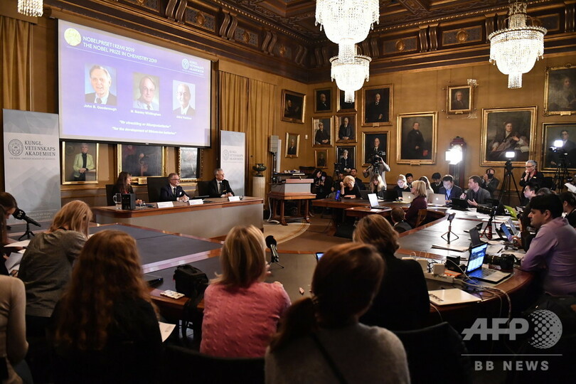 【10月9日 AFP】(更新、写真追加)スウェーデン王立科学アカデミー(Royal Swedish Academy of Sciences)は9日、2019年のノーベル化学賞(Nobel Prize in Chemistry)を、リチウムイオン電池を開発した吉野彰(Akira Yoshino)氏(71)、米国のジョン・グッドイナフ(John Goodenough)氏(97)、英国のスタンリー・ウィッティンガム(Stanley Whittingham)氏(77)に授与すると発表した。