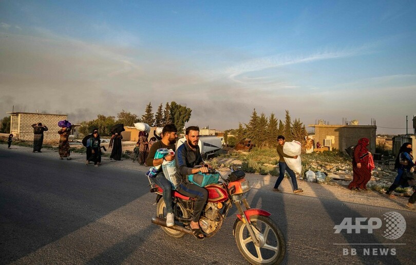 シリア北部の一帯では10日、自宅を逃れた民間人らが車や徒歩で家財を運びながら避難する姿が見られた。国連人道問題調整事務所(OCHA)の10日の発表によると、トルコの進攻開始からこれまでに避難を余儀なくされた人は、推計7万人に上っている。