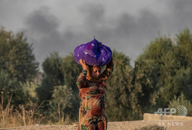 シリア北部の一帯では10日、自宅を逃れた民間人らが車や徒歩で家財を運びながら避難する姿が見られた。国連人道問題調整事務所(OCHA)の10日の発表によると、トルコの進攻開始からこれまでに避難を余儀なくされた人は、推計7万人に上っている。