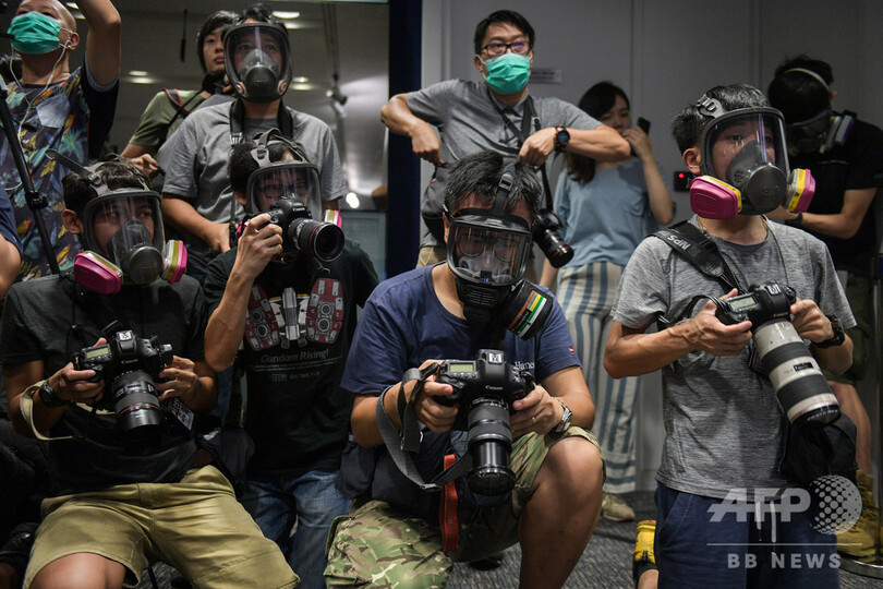 【10月19日 AFP】香港で、ガスマスクを着けて警察当局による記者会見に臨むカメラマンら。