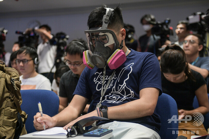 【10月19日 AFP】香港で、ガスマスクを着けて警察当局による記者会見に臨むカメラマンら。