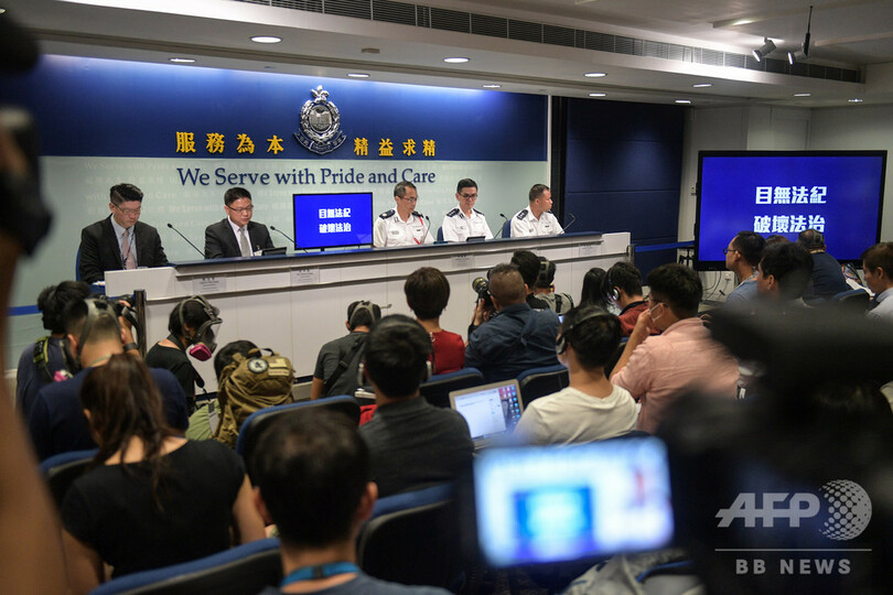 【10月19日 AFP】香港で、ガスマスクを着けて警察当局による記者会見に臨むカメラマンら。