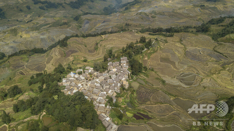 【10月14日 CNS】中国・雲南省(Yunnan)紅河ハニ族イ族自治州(Honghe Hani and Yi Autonomous Prefecture)元陽県(Yuanyang)で4日、少数民族ハニ族の棚田を空撮した。棚田は紅河近くの哀牢山(Ailaoshan)南部に位置し、古くからここで暮らしてきたハニ族の農民たちが何代にもわたり山肌を耕し、独自のかんがい技術や農法によってつくり上げた。(c)CNS/JCM/AFPBB News