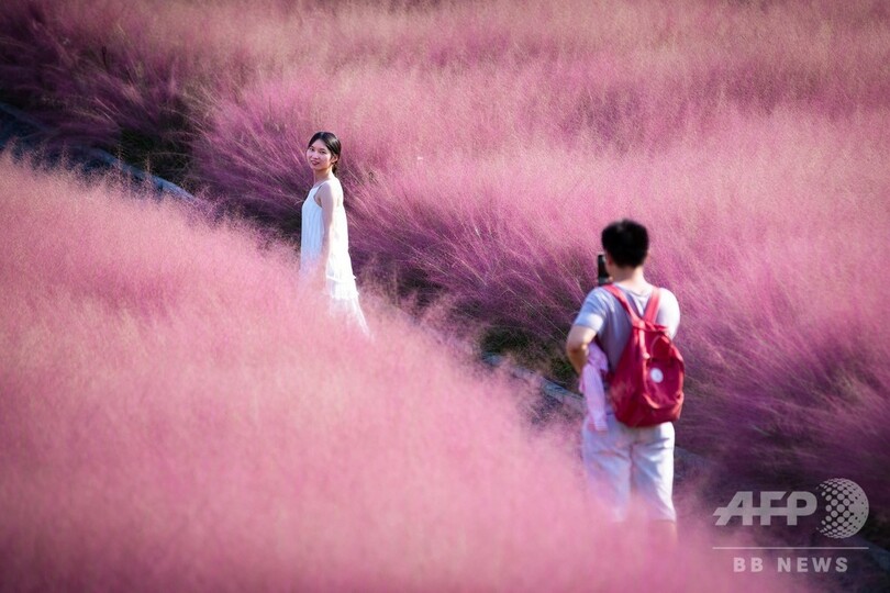 【10月15日 CNS】中国・江蘇省(Jiangsu)句容市(Jurong)芝桜小鎮(Zhiying Xiaozhen)で国慶節休暇中の3日、ミューリーグラスがシーズンを迎え、ピンク色に染まった田園が来場者を魅了した。(c)CNS/JCM/AFPBB News