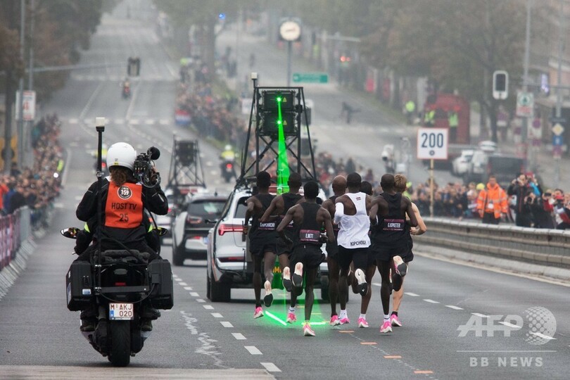 キプチョゲは、総勢41人のペースメーカーとスピードを設定する先導車にともなわれ、2年前にイタリア・モンツァ(Monza)で達成を逃した記録を打ち破った。