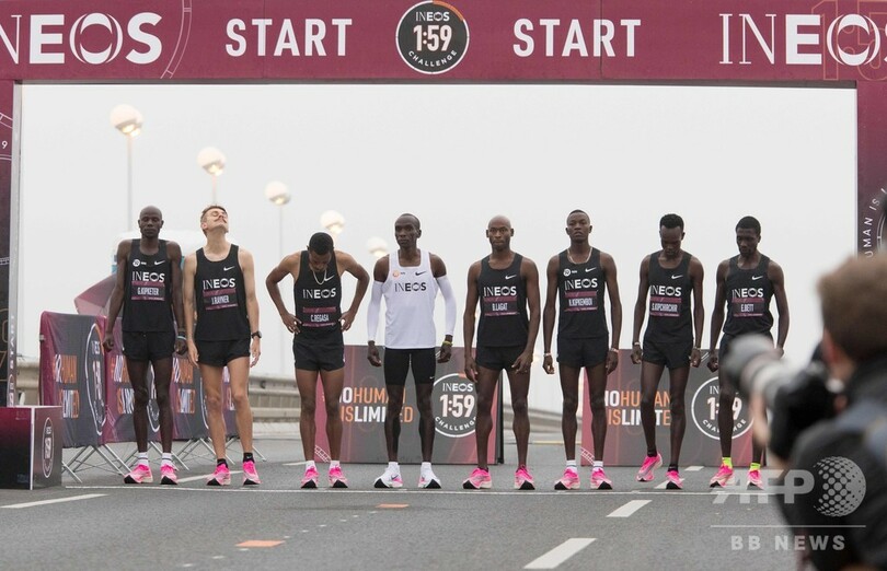 キプチョゲは、総勢41人のペースメーカーとスピードを設定する先導車にともなわれ、2年前にイタリア・モンツァ(Monza)で達成を逃した記録を打ち破った。