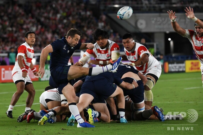 日本は28-21でスコットランドを下して4連勝でプール首位に立ち、W杯で初の8強入りを決めた。(c)AFP