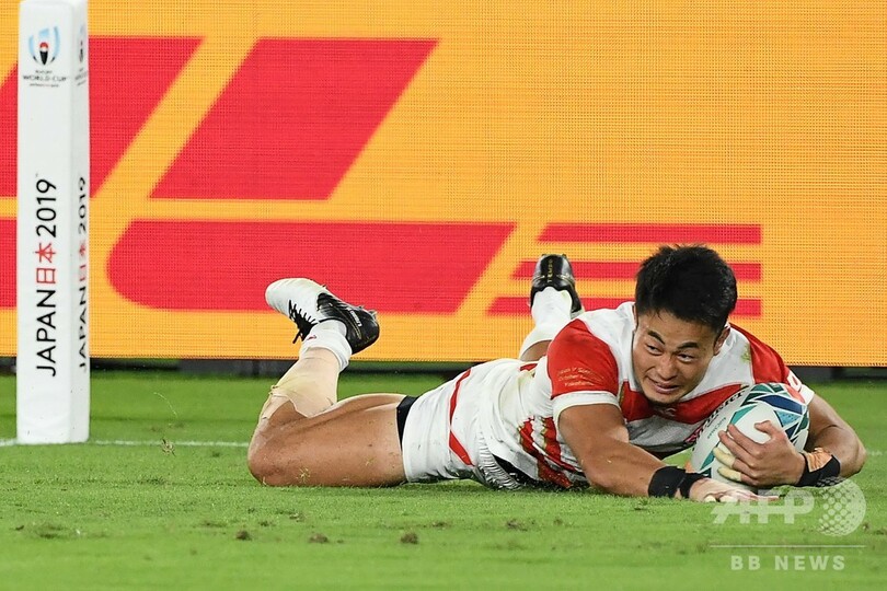 日本は28-21でスコットランドを下して4連勝でプール首位に立ち、W杯で初の8強入りを決めた。(c)AFP