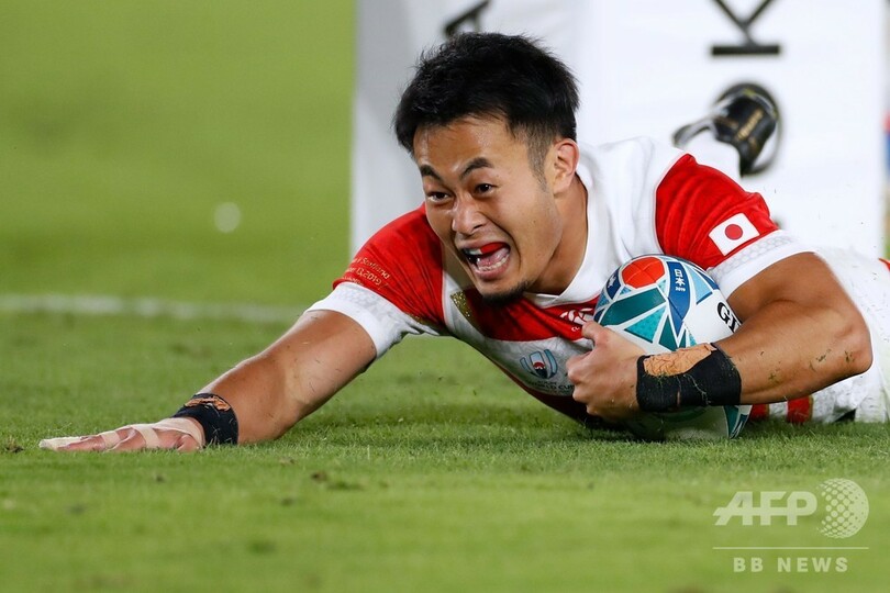 日本は28-21でスコットランドを下して4連勝でプール首位に立ち、W杯で初の8強入りを決めた。(c)AFP
