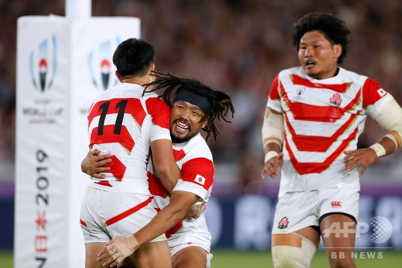 日本は28-21でスコットランドを下して4連勝でプール首位に立ち、W杯で初の8強入りを決めた。(c)AFP