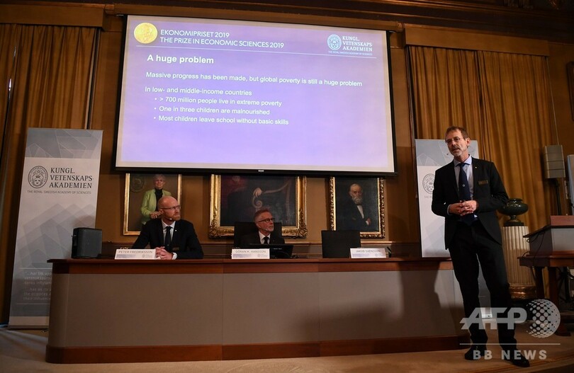 【10月14日 AFP】(更新、写真追加)スウェーデン王立科学アカデミー(Royal Swedish Academy of Sciences)は14日、2019年のノーベル経済学賞(Nobel Prize in Economics)を、貧困に関する研究の業績で、インド出身の米国人アビジット・バナジー(Abhijit Banerjee)氏、フランス出身の米国人エスター・デュフロ(Esther Duflo)氏、米国人のマイケル・クレマー(Michael Kremer)氏に授与すると発表した。