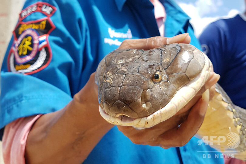 捕獲されたキングコブラは、後に野生に戻された。(c)AFP