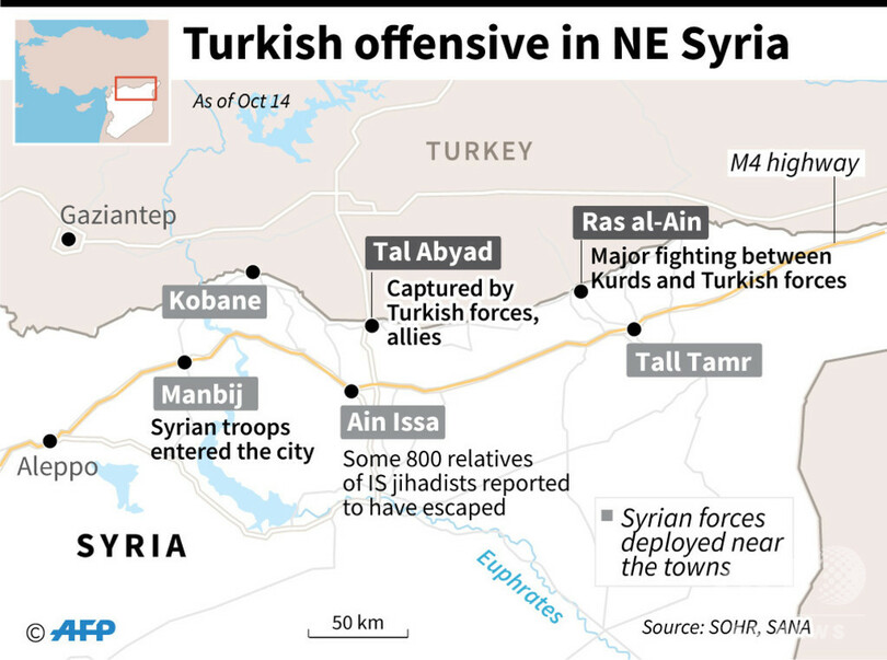 米国とクルド人勢力はイスラム過激派組織「イスラム国(IS)」掃討作戦で数年間にわたり協力してきたが、米軍の撤収により見捨てられた形となったクルド人勢力はシリア政府に支援を要請。シリア政権軍は14日夜、対トルコ国境に近い要衝都市マンビジ(Manbij)に入った。一方、トルコ側の部隊は計画されている攻勢に先立ち西方に集結している。