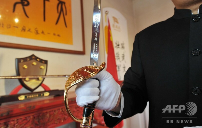 「天下第一刀」は使用開始後から今日に至るまで、1997年の香港返還、1999年のマカオ返還と国慶節第閲兵などの重大イベントを見届けてきた。今後は、長期的に同展示館で展示し、無料で一般公開を続ける。(c)CNS/JCM/AFPBB News