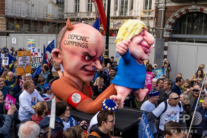 【10月20日 AFP】英首都ロンドンの議会前で19日、国内各地から集まった大勢の欧州連合(EU)残留派が横断幕やプラカード、旗を掲げてデモを行い、EU離脱(ブレグジット、Brexit)をめぐる国民投票の再実施を求めた。議会が離脱案の採決を見送ったとの知らせが届くと、喝采が湧いた。
