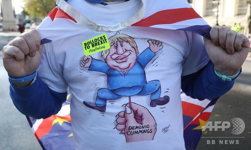 【10月20日 AFP】英首都ロンドンの議会前で19日、国内各地から集まった大勢の欧州連合(EU)残留派が横断幕やプラカード、旗を掲げてデモを行い、EU離脱(ブレグジット、Brexit)をめぐる国民投票の再実施を求めた。議会が離脱案の採決を見送ったとの知らせが届くと、喝采が湧いた。
