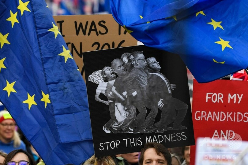 【10月20日 AFP】英首都ロンドンの議会前で19日、国内各地から集まった大勢の欧州連合(EU)残留派が横断幕やプラカード、旗を掲げてデモを行い、EU離脱(ブレグジット、Brexit)をめぐる国民投票の再実施を求めた。議会が離脱案の採決を見送ったとの知らせが届くと、喝采が湧いた。