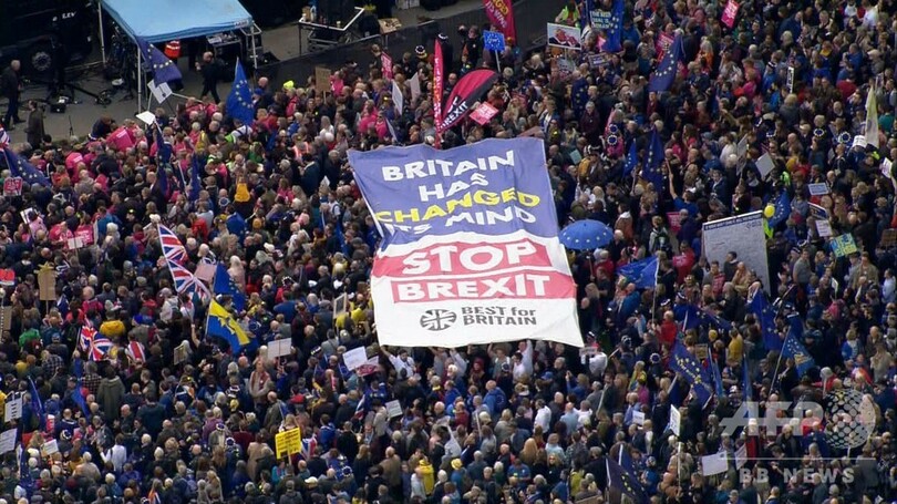 【10月20日 AFP】英首都ロンドンの議会前で19日、国内各地から集まった大勢の欧州連合(EU)残留派が横断幕やプラカード、旗を掲げてデモを行い、EU離脱(ブレグジット、Brexit)をめぐる国民投票の再実施を求めた。議会が離脱案の採決を見送ったとの知らせが届くと、喝采が湧いた。