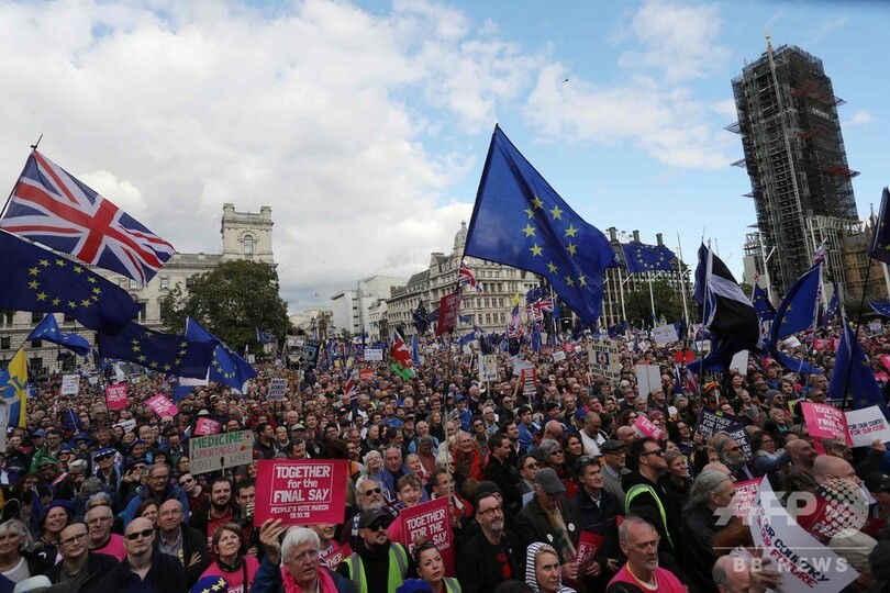 【10月20日 AFP】英首都ロンドンの議会前で19日、国内各地から集まった大勢の欧州連合(EU)残留派が横断幕やプラカード、旗を掲げてデモを行い、EU離脱(ブレグジット、Brexit)をめぐる国民投票の再実施を求めた。議会が離脱案の採決を見送ったとの知らせが届くと、喝采が湧いた。