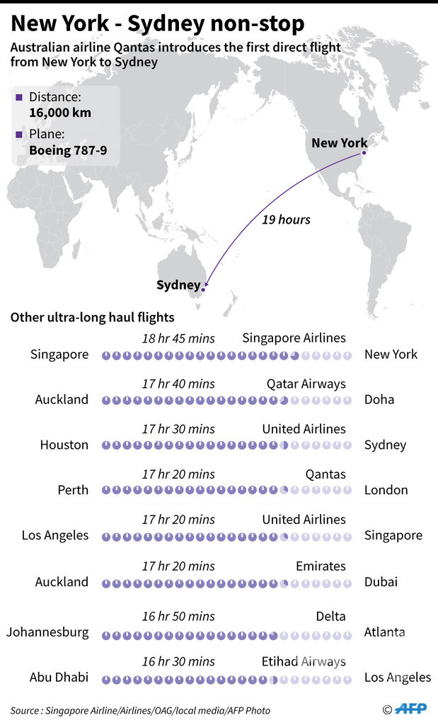 ニューヨークで同便に搭乗した乗客たちは、まず豪東部時間に時計をあわせる。機内の照明は明るいまま、乗客たちは軽い運動をさせられる。さらに、カフェインや香辛料入りの機内食が提供される。全て、シドニーの時間で夜になるまで乗客を眠らせない工夫だ。離陸から6時間後、乗客たちに高炭水化物の機内食が提供され、ようやく照明が落とされて乗客は眠りにつくことができた。(c)AFP