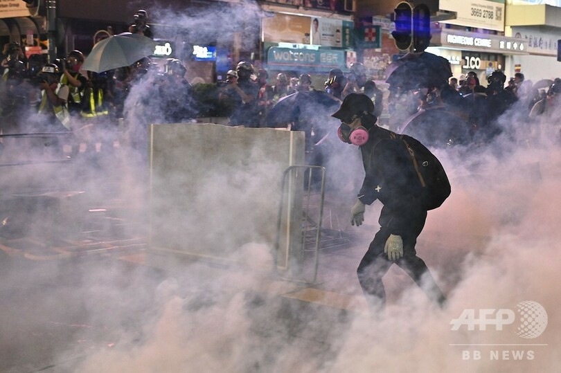 香港で無許可デモに数万人、火炎瓶投げ店舗破壊 警官隊は放水銃で対応