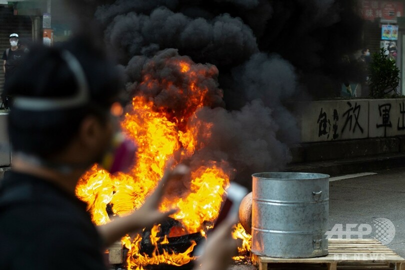香港で無許可デモに数万人、火炎瓶投げ店舗破壊 警官隊は放水銃で対応