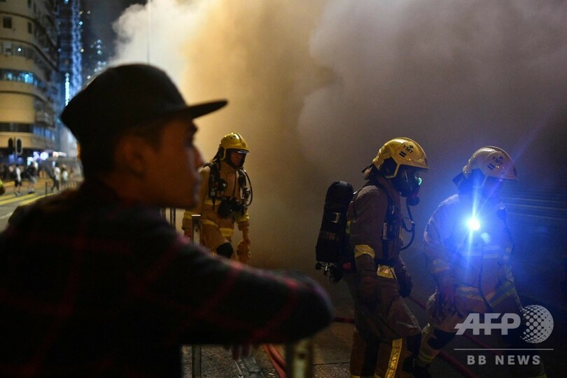 香港で無許可デモに数万人、火炎瓶投げ店舗破壊 警官隊は放水銃で対応