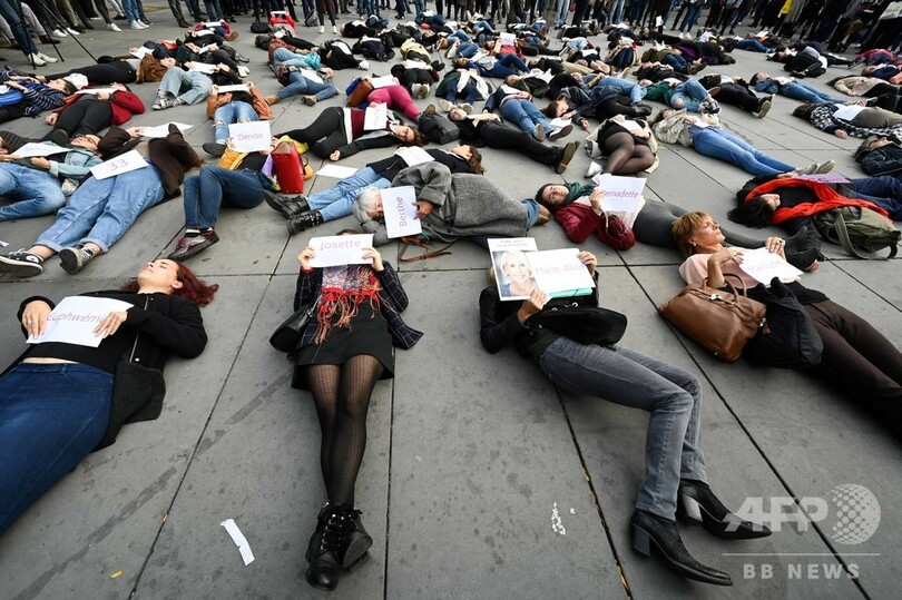 【10月21日 AFP】仏パリのレピュブリック広場(Place de la Republique)で19日、女性を標的とする殺人「フェミサイド」を非難し、地面に横たわる抗議運動「ダイイン」が行われた。複数の組織の呼びかけで行われたもので、参加者らは女性の名前の書かれたプラカードを持って地面に横たわり、抗議の意を表明した。(c)AFP