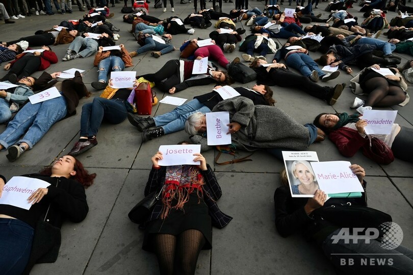 【10月21日 AFP】仏パリのレピュブリック広場(Place de la Republique)で19日、女性を標的とする殺人「フェミサイド」を非難し、地面に横たわる抗議運動「ダイイン」が行われた。複数の組織の呼びかけで行われたもので、参加者らは女性の名前の書かれたプラカードを持って地面に横たわり、抗議の意を表明した。(c)AFP