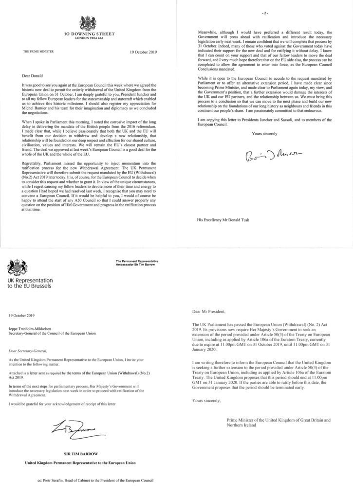 これに加え、ティム・バロウ(Tim Barrow)英駐EU大使が3通目となる書簡(カバーレター)で、離脱延期を要請する書簡を送ったのは法律を順守するためにすぎないと説明していた。