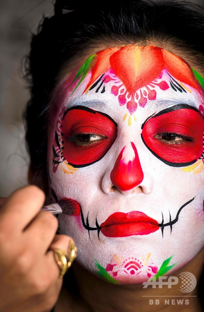 【10月28日 AFP】メキシコの首都メキシコ市で26日、来月の「死者の日(Day of the Dead)」を前に、シンボルとなっている骸骨の貴婦人「カトリーナ(Catrina)」に扮(ふん)した人々が、レフォルマ通り(Reforma Avenue)を練り歩いた。