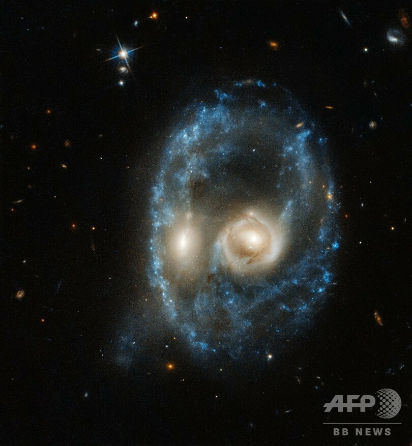 【10月29日 AFP】同じ大きさの二つの銀河が衝突し、幽霊の顔のように見えている状態をハッブル宇宙望遠鏡(Hubble Space Telescope)が捉えた。今年6月に撮影された画像を、欧州南天天文台(ESO)と米宇宙望遠鏡科学協会(Space Telescope Science Institute)が今月28日に公開した。
